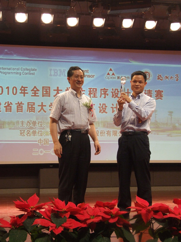 经过激烈角逐,分别决出了“顶点杯”全国大学生程序设计邀请赛及福建省首届大学生程序设计竞赛金、银、铜奖及冠军队。复旦大学代表队获得全国邀请赛冠军,福州大学代表队获得福建省竞赛冠军。福建乐动网页版严孟宇董事长向获得冠军的复旦大学代表队和福州大学代表队颁发了“顶点杯”。在闭幕式上,竞赛承办单位福州大学高诚辉副校长还向顶点公司严孟宇董事长授予了本次竞赛纪念杯。