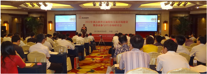 9月26日,2012年度的顶点软件区域股权交易市场建设暨券商参与OTC市场研讨会在上海举行,来自国内70多家政府金融办、股权交易机构和券商的一百多位嘉宾出席了此次研讨会。